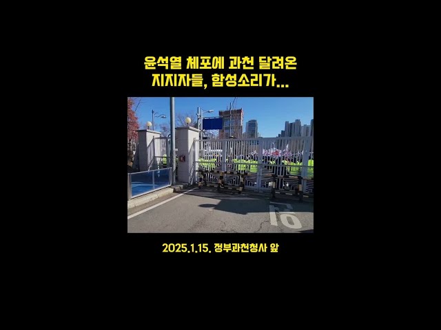 공조수사본부가 윤석열 대통령에 대해 내란 수괴 혐의로 15일 오전 10시 33분 체포영장을 집행, 윤 대통령이 과천에 위치한 공수처에서 조사를 받고 있는 가운데 15일 오후 1시경 윤 대통령 지지자들 수백여 명이 정부과천청사 정문 앞 도로를 점거하고 시위를 벌이고 있다. 경찰은 신고된 집회 장소로 이동하라고 방송을 거듭했지만 집회 참가자들은 움직이지 않고 있다. (기획-편집: 박순옥 기자, 촬영: 선대식 기자) #윤석열#체포#지지자들#과천#시위